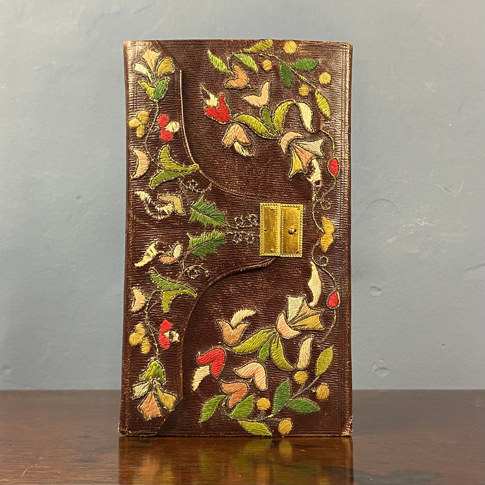 A grained leather, embroidered and gold clasp book, mid 19th C.